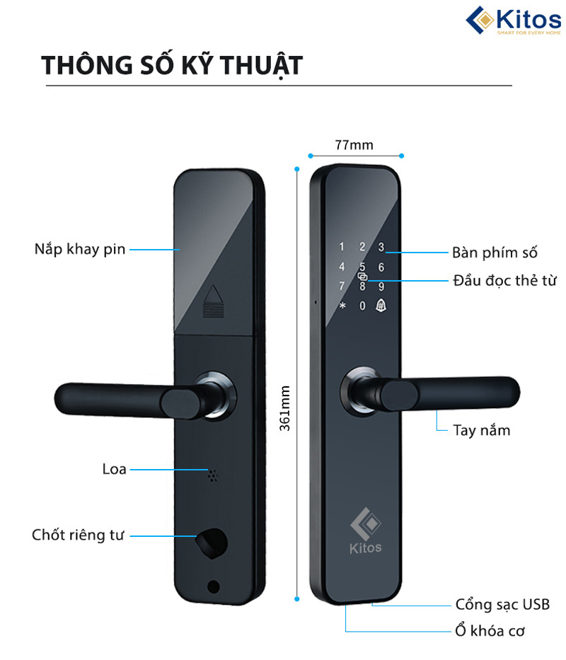 Khóa cửa thẻ từ mã số Kitos KT-V1 là mẫu khóa mới của thương hiệu Kitos – Nhật Bản được ra mắt thị trường Việt Nam năm 2021. Đây là mẫu khóa hiện đại, tích hợp nhiều tính năng mở khóa như mã số ảo, thẻ từ thông minh, chìa cơ dự phòng và đặc biệt là tính năng kết nối App, quản lý và mở khóa từ xa một cách dễ dàng.